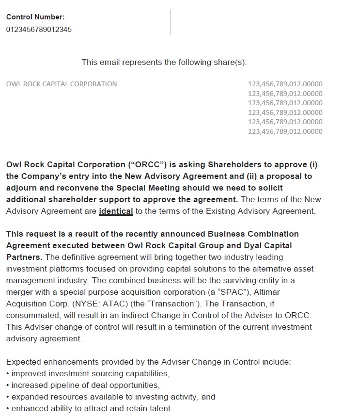 Control Number: 0123456789012345 This email represents the following share(s): OWL ROCK CAPITAL CORPORATION 123,456,789,012.00000 123,456,789,012.00000 123,456,789,012.00000 123,456,789,012.00000 123,456,789,012.00000 123,456,789,012.00000 Owl Rock Capital Corporation (“ORCC”) is asking Shareholders to approve (i) the Company’s entry into the New Advisory Agreement and (ii) a proposal to adjourn and reconvene the Special Meeting should we need to solicit additional shareholder support to approve the agreement. The terms of the New Advisory Agreement are identical to the terms of the Existing Advisory Agreement. This request is a result of the recently announced Business Combination Agreement executed between Owl Rock Capital Group and Dyal Capital Partners. The definitive agreement will bring together two industry leading investment platforms focused on providing capital solutions to the alternative asset management industry. The combined business will be the surviving entity in a merger with a special purpose acquisition corporation (a “SPAC”), Altimar Acquisition Corp. (NYSE: ATAC) (the “Transaction”). The Transaction, if consummated, will result in an indirect Change in Control of the Adviser to ORCC. This Adviser change of control will result in a termination of the current investment advisory agreement. Expected enhancements provided by the Adviser Change in Control include: • improved investment sourcing capabilities, • increased pipeline of deal opportunities, • expanded resources available to investing activity, and • enhanced ability to attract and retain talent. |