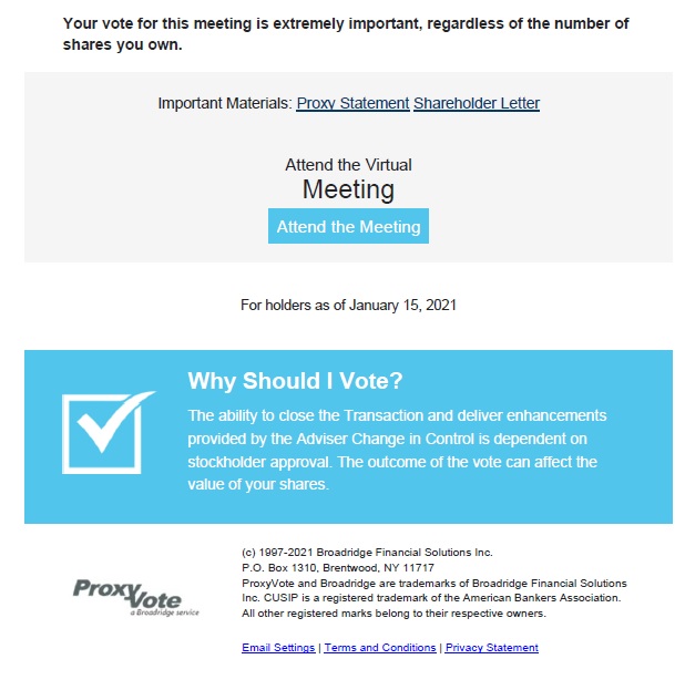 Your vote for this meeting is extremely important, regardless of the number of shares you own. Important Materials: Proxy Statement Shareholder Letter Attend the Virtual Meeting Attend the Meeting For holders as of January 15, 2021 Why Should I Vote? The ability to close the Transaction and deliver enhancements provided by the Adviser Change in Control is dependent on stockholder approval. The outcome of the vote can affect the value of your shares. (c) 1997-2021 Broadridge Financial Solutions Inc. P.O. Box 1310, Brentwood, NY 11717 ProxyVote and Broadridge are trademarks of Broadridge Financial Solutions Inc. CUSIP is a registered trademark of the American Bankers Association. All other registered marks belong to their respective owners. Email Settings | Terms and Conditions | Privacy Statement