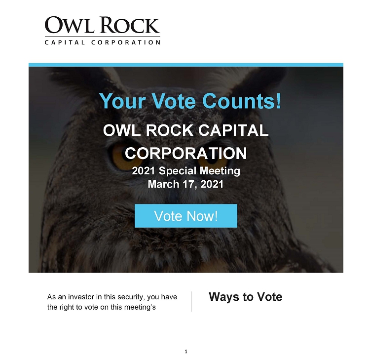 ToppanMerrill Service From: Sent: To: Subject: SPECIMEN <id@proxyvote.com> Wednesday, February 24, 2021 3:50 PM Krause, Dominique x57356 #ORCC21PXY# ORCC Holder: Proxy Advisory Firms ISS and Glass Lewis Announce Support of Special Meeting Proposals %R15592_0_0123456789012345_0000001% Ways to Vote As an investor in this security, you have the right to vote on this meeting’s 1 Your Vote Counts! OWL ROCK CAPITAL CORPORATION 2021 Special Meeting March 17, 2021 Vote Now! To help protect y our priv acy , Microsoft O ffice prev ented automatic download of this picture from the Internet. |