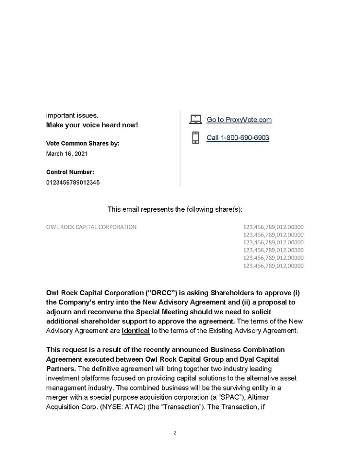 important issues. Make your voice heard now! y our priv acy , prev ented lo ad o f this Internet. Go to ProxyVote.com y our priv acy , lo ad o f this prev ented Internet. Call 1-800-690-6903 Vote Common Shares by: March 16, 2021 Control Number: 0123456789012345 This email represents the following share(s): OWL ROCK CAPITAL CORPORATION 123,456,789,012.00000 123,456,789,012.00000 123,456,789,012.00000 123,456,789,012.00000 123,456,789,012.00000 123,456,789,012.00000 Owl Rock Capital Corporation (“ORCC”) is asking Shareholders to approve (i) the Company’s entry into the New Advisory Agreement and (ii) a proposal to adjourn and reconvene the Special Meeting should we need to solicit additional shareholder support to approve the agreement. The terms of the New Advisory Agreement are identical to the terms of the Existing Advisory Agreement. This request is a result of the recently announced Business Combination Agreement executed between Owl Rock Capital Group and Dyal Capital Partners. The definitive agreement will bring together two industry leading investment platforms focused on providing capital solutions to the alternative asset management industry. The combined business will be the surviving entity in a merger with a special purpose acquisition corporation (a “SPAC”), Altimar Acquisition Corp. (NYSE: ATAC) (the “Transaction”). The Transaction, if 2 To help protect Mi crosoft O ffice auto matic down picture from the To help protect Mi crosoft O ffice auto matic down picture from the |