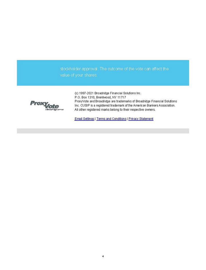 (c) 1997-2021 Broadridge Financial Solutions Inc. P.O. Box 1310, Brentwood, NY 11717 ProxyVote and Broadridge are trademarks of Broadridge Financial Solutions Inc. CUSIP is a registered trademark of the American Bankers Association. All other registered marks belong to their respective owners. Email Settings | Terms and Conditions | Privacy Statement 4 To help protect y ou r priv acy , Microsoft O ffice prev ented automatic download of this picture from the Internet. Prov y Vote stockholder approval. The outcome of the vote can affect the value of your shares. |